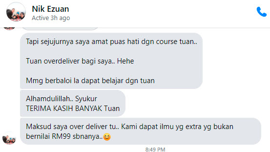 Setiap kali selepas kelas anda akan mendapat sesi tambahan selama 1 jam untuk Q & A. Sesi ini akan dijalankan secara melalui applikasi ZOOM di mana anda boleh tanya apa yang tidak faham kepada saya secara direct